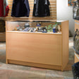 The 1/4 Glass Counter from UK Shopfittings Ltd is expertly crafted from melamine-faced MDF for strength and durability. Measuring approximately 900mm high, 1200mm wide, and 600mm deep, it features open storage at the rear with one adjustable shelf for flexible use. This counter is designed to coordinate seamlessly with UK Shopfittings' slatwall panels, providing a professional and cohesive retail display solution.