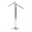 This adjustable 2 arm rail features two sloping arms, each independently adjustable in 3-inch increments from 48" to 72". Twin uprights constructed from 1" square tube provide sturdy support, anchored to a heavy weighted base measuring 12" x 15". The adjustable feet ensure stability on uneven surfaces, while the mirror finish chrome offers a sleek, professional appearance suitable for various retail environments.