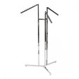 This adjustable 3 arm rail features three sloping arms, each independently adjustable in 3-inch increments from 48" to 72". Twin uprights constructed from 1" square tube provide sturdy support, anchored to a heavy weighted base measuring 12" x 15". The adjustable feet ensure stability on uneven surfaces, while the mirror finish chrome offers a sleek, professional appearance suitable for various retail environments.