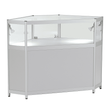 This premium corner display counter combines functionality with professional aesthetics, making it an essential fixture for retail environments. Constructed from silver anodised aluminium and 6mm toughened safety glass, it offers a secure showcase for high-value merchandise whilst maintaining clear visibility. The dual-purpose design features a lockable display area for featured products and a separate lockable storage compartment with door, ideal for managing inventory at point of sale. Four integrated 4W LED lights provide optimal product illumination, whilst adjustable feet ensure stable positioning on uneven floors. Silver and grey timber infill panels complement the contemporary frame design. Complete with integral on/off switch for convenient operation. Supplied flat-packed with assembly instructions and delivered via palletised service for safe transit.