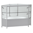 This premium corner display counter combines functionality with professional aesthetics, making it an essential fixture for retail environments. Constructed from silver anodised aluminium and 6mm toughened safety glass, it offers a secure showcase for high-value merchandise whilst maintaining clear visibility. The dual-purpose design features a lockable display area for featured products and a separate lockable storage compartment with door, ideal for managing inventory at point of sale. Eight integrated 4W LED lights provide optimal product illumination, whilst adjustable feet ensure stable positioning on uneven floors. Silver and grey timber infill panels complement the contemporary frame design. Complete with integral on/off switch for convenient operation. Supplied flat-packed with assembly instructions and delivered via palletised service for safe transit.