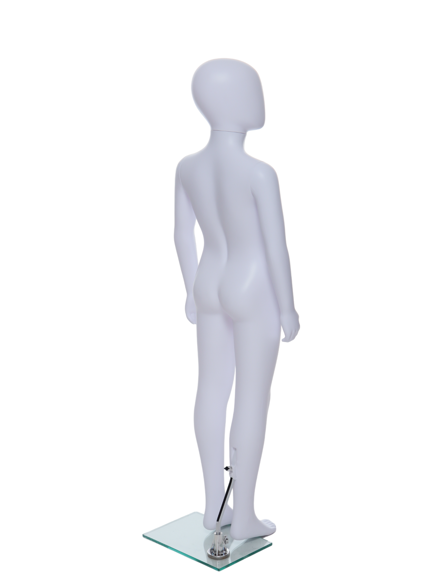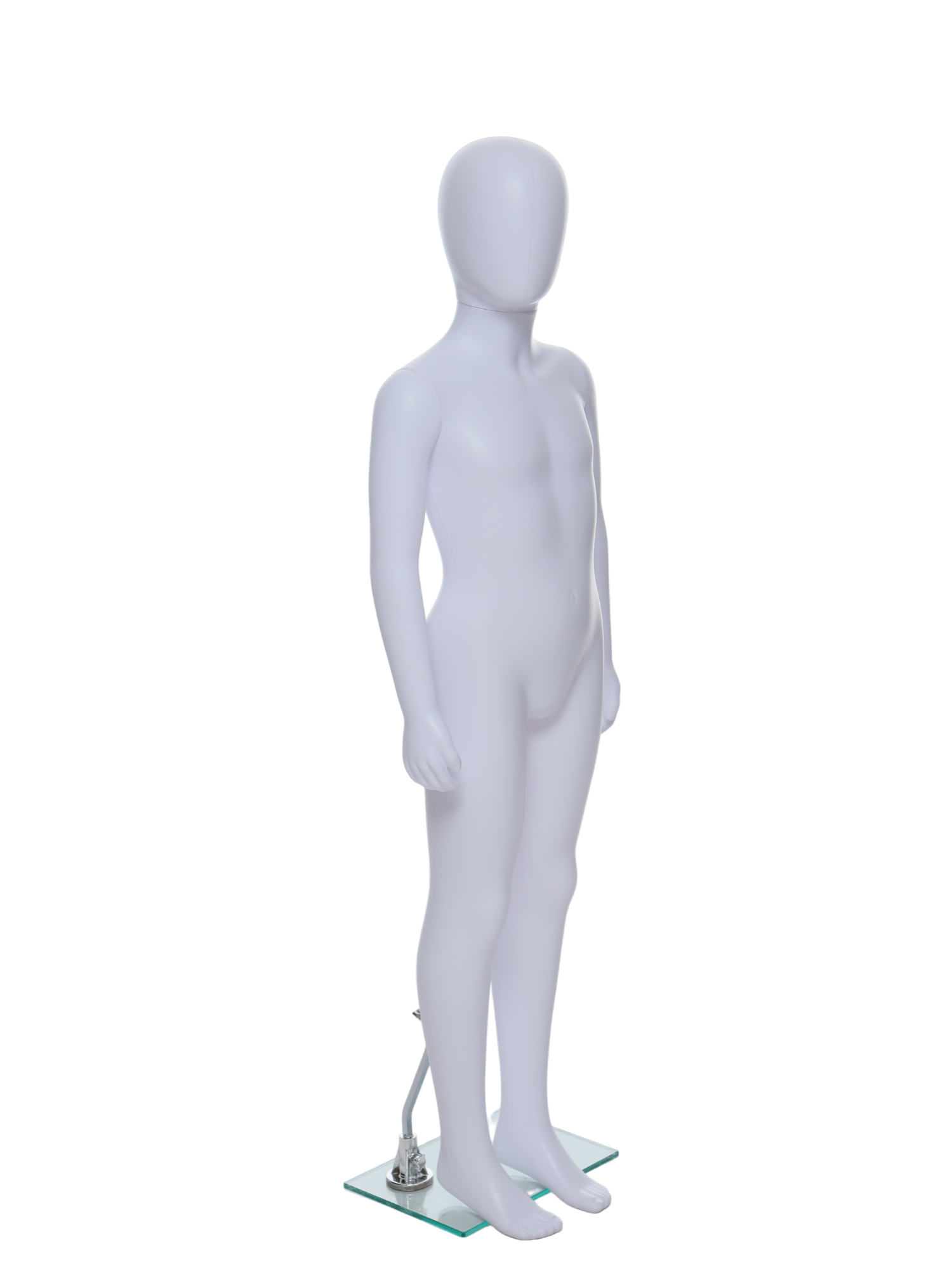 This unisex child mannequin features a full-bodied design with a smooth matt white finish and a minimalist egg-shaped head, suitable for showcasing a broad range of children’s clothing and accessories. Made from durable, virtually unbreakable plastic, it ensures resilience and longevity. The mannequin includes an 8mm thick toughened glass base for stability, plus a calf and foot kit to accommodate socks and shoes. Adjustable head and arms allow for multiple poses, while its lightweight construction supports easy handling and transport, making it ideal for professional retail displays.