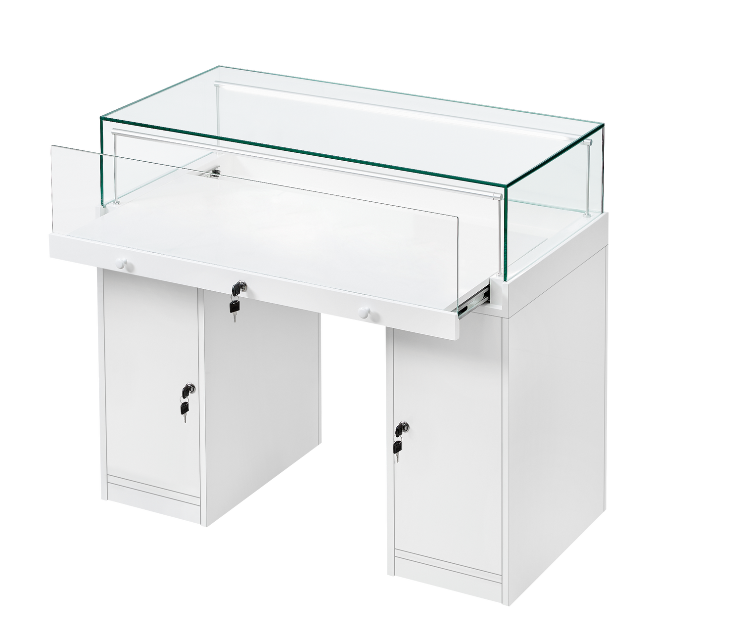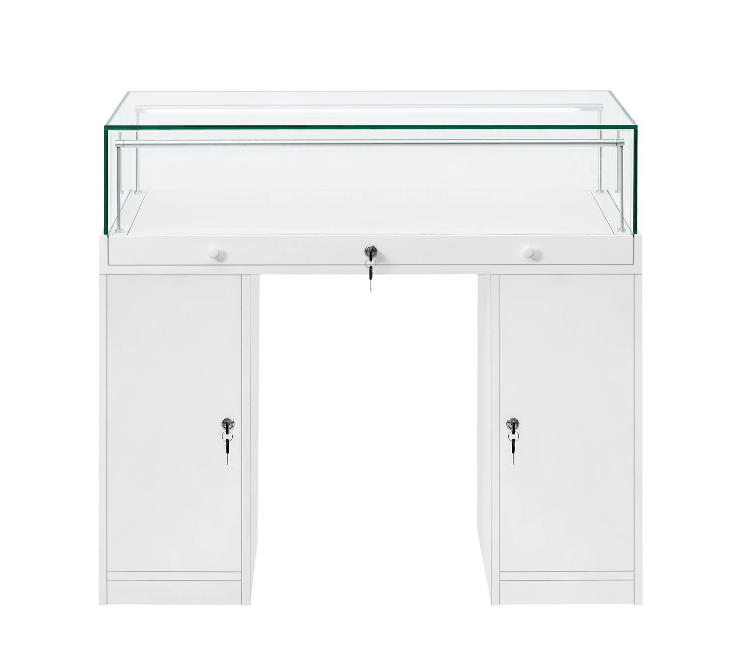 The Counter Display Case R2721W is a refined retail solution engineered for discerning establishments including jewellery boutiques, museums, and galleries. The showcase features premium 8mm toughened safety glass with dual adjustable LED strip lights, delivering exceptional product visibility and professional presentation. Storage flexibility is paramount—a secure set of two lockable cupboards underneath safeguards high-value inventory, whilst provide convenient stock organisation. Delivered across three cartons for manageable transport, assembly is streamlined with a pre-assembled glass cabinet and flat-packed cupboard components accompanied by comprehensive instructions.