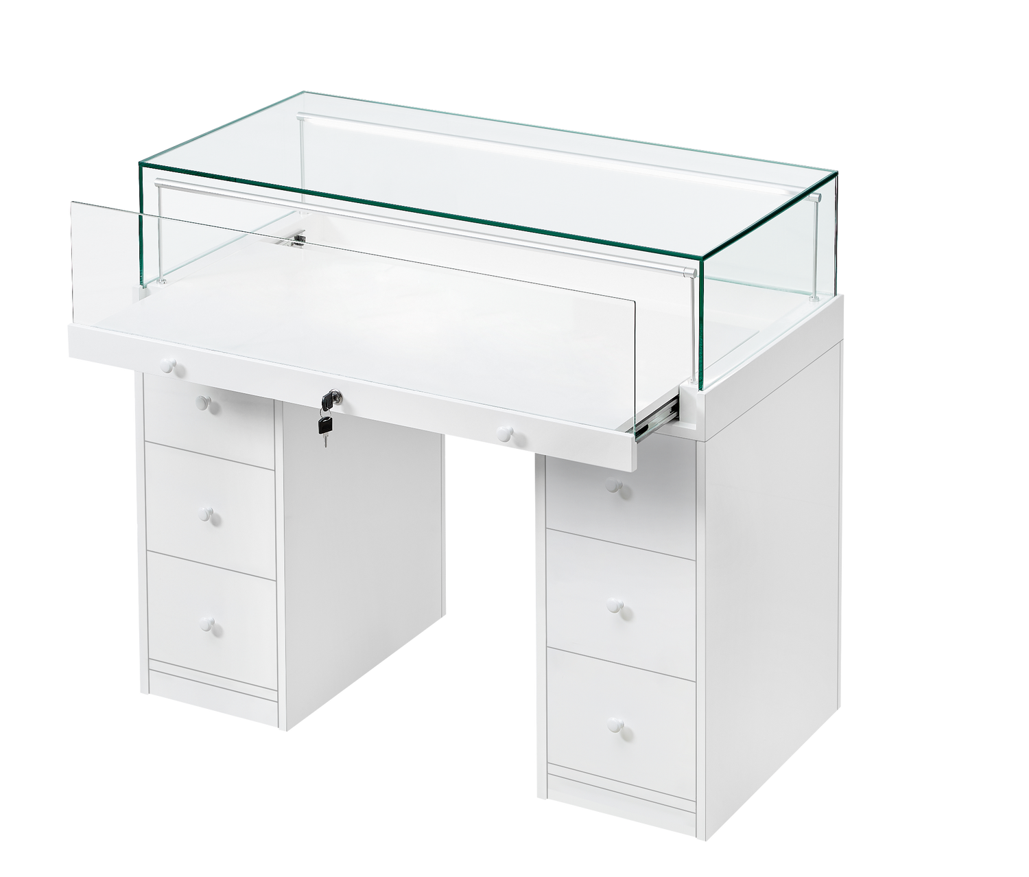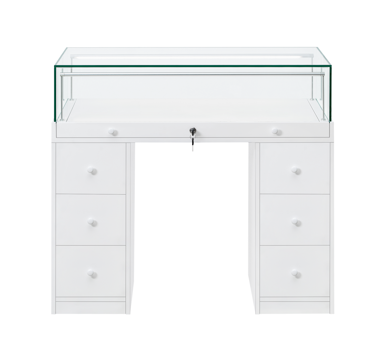 The Counter Display Case R2722W is a refined retail solution engineered for discerning establishments including jewellery boutiques, museums, and galleries. The showcase features premium 8mm toughened safety glass with dual adjustable LED strip lights, delivering exceptional product visibility and professional presentation. Storage flexibility is paramount, with two sets of three accessible drawers underneath the display area provide convenient stock organisation. Delivered across three cartons for manageable transport, assembly is streamlined with a pre-assembled glass cabinet and flat-packed cupboard components accompanied by comprehensive instructions.