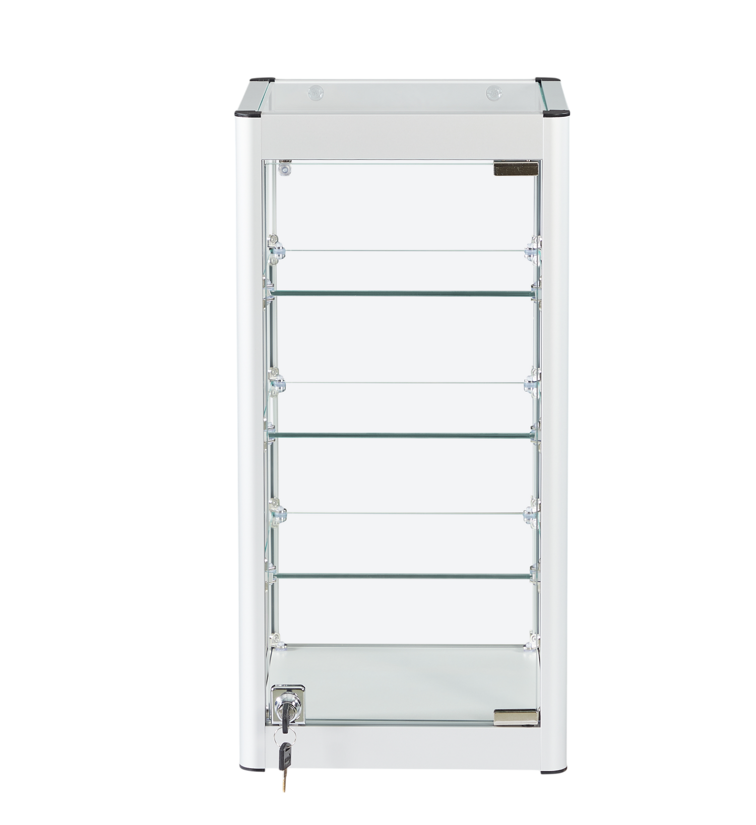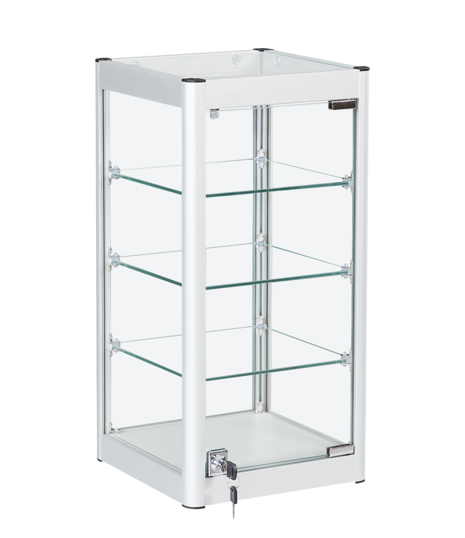 The Counter Top Display Cabinet - R2502S combines Silver anodised aluminium and toughened safety glass to securely showcase valuable items. Designed for retail and reception environments, it offers a sturdy, professional solution ideal for gifts, jewellery, cosmetics, electronics, and fireworks. Its compact design fits perfectly on counters, providing high visibility while ensuring product protection.