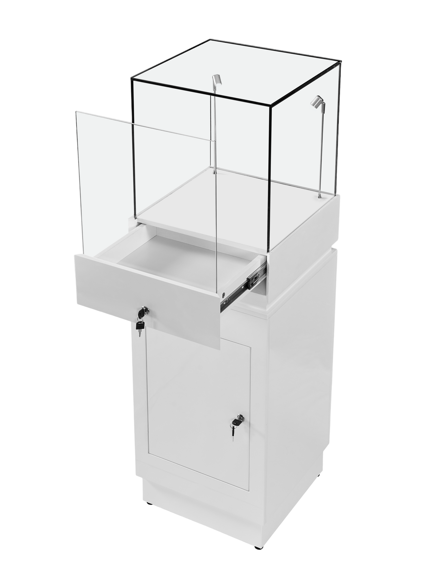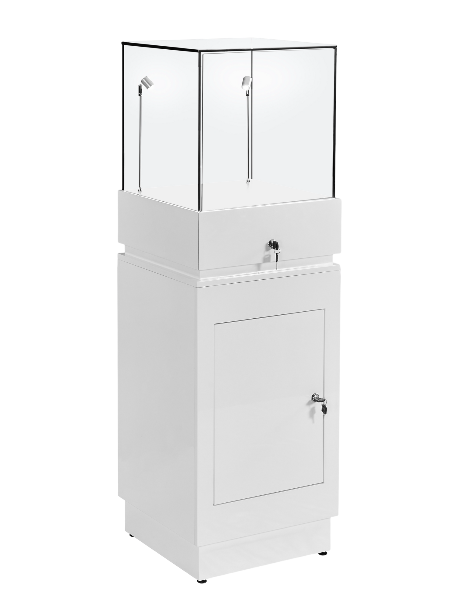 The Display Plinth Showcase R2614W combines elegant presentation with secure storage, ideal for retail environments, museums, and duty-free settings. Standing 1600mm tall, this lockable tower features a white wooden plinth base (1200mm x 400mm) housing a concealed drawer and locking cupboard with internal shelf. The 400mm glass cube top provides unobstructed 360-degree visibility of premium merchandise. Dual LED lights enhance product appeal and visibility. Designed for straightforward assembly, supplied in two cartons for convenient handling and installation.