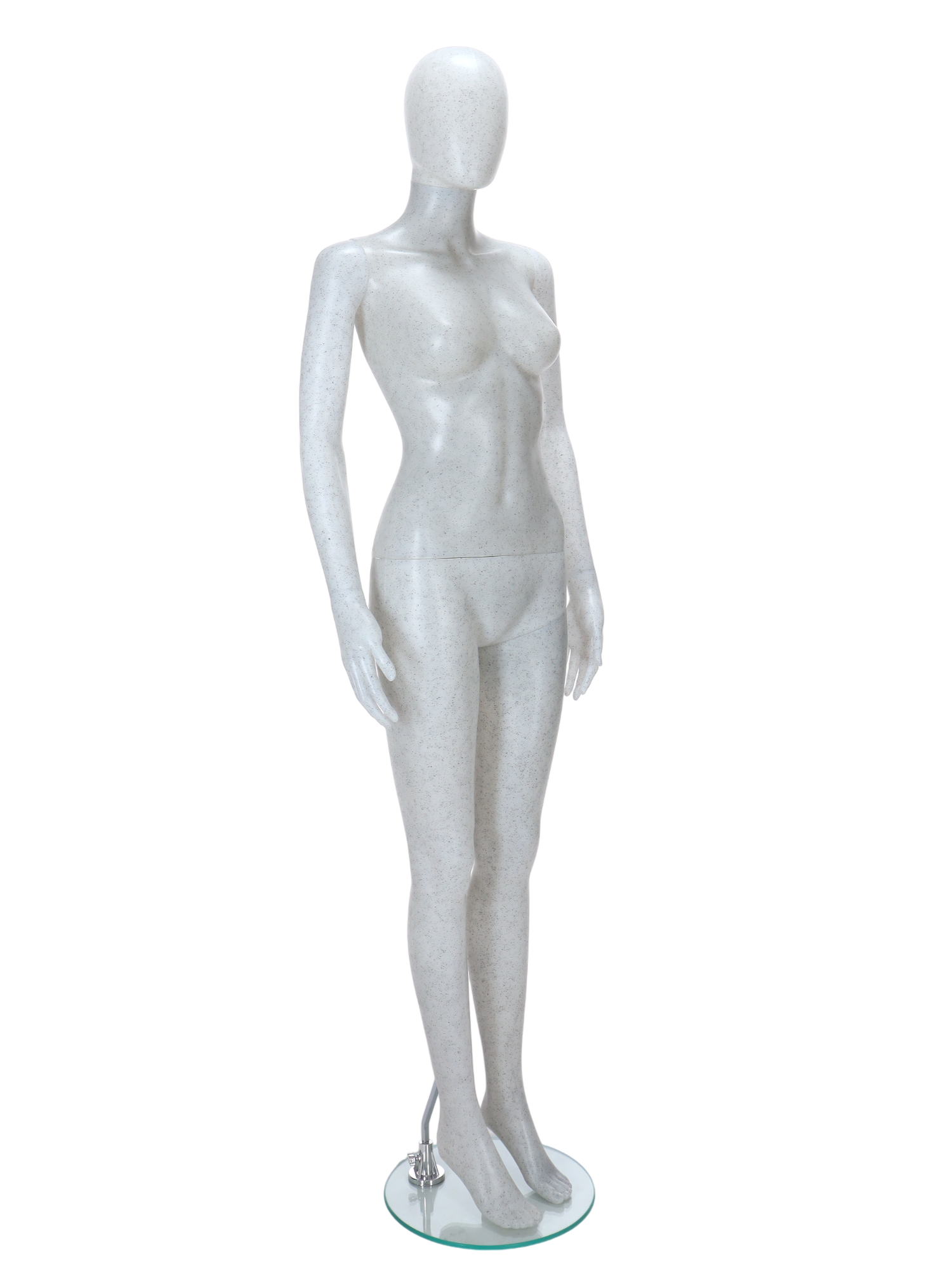 This Female Mannequin R345 features a durable, flecked white finish with black flecks, combining style and resilience. Its adjustable head and arms enable versatile posing to showcase a wide range of clothing, accessories, and jewellery. Made from tough plastic, it is lightweight yet virtually unbreakable. Supplied with a robust 8mm thick toughened glass base and a calf and foot kit, it accommodates sock and shoe displays efficiently. Ideal for professional retail settings, this mannequin offers durability and flexibility for effective merchandising.
