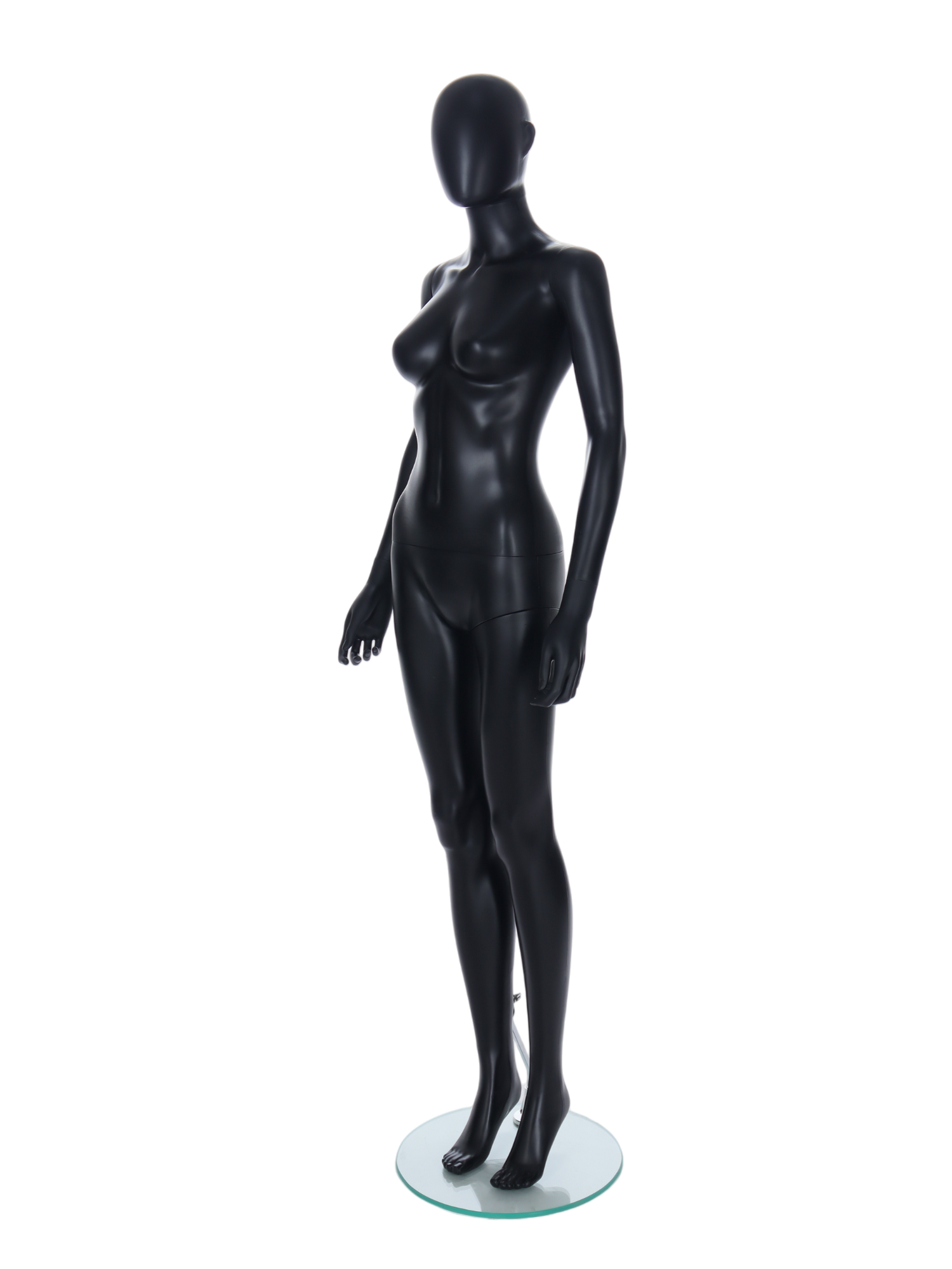 This black-finished female mannequin offers a versatile display solution with its full-bodied design, adjustable head, and arms for various poses. Constructed from durable plastic, it withstands wear while remaining lightweight for easy handling. The mannequin includes a toughened glass base and a calf and foot kit, accommodating sock and shoe displays. Its egg-shaped head with ears adds subtle detail, making it well-suited for showcasing clothing, accessories, and jewellery with professionalism and style.