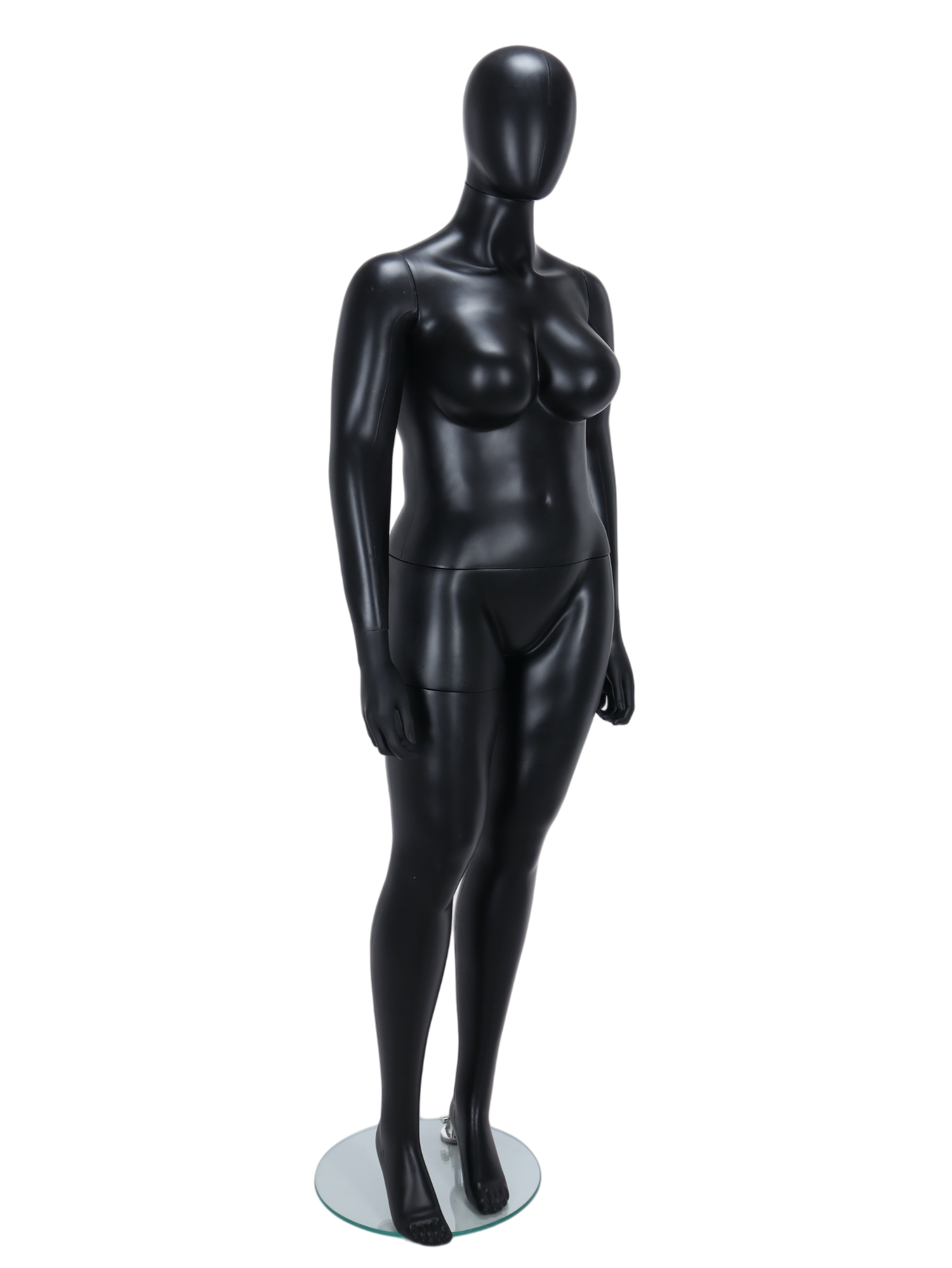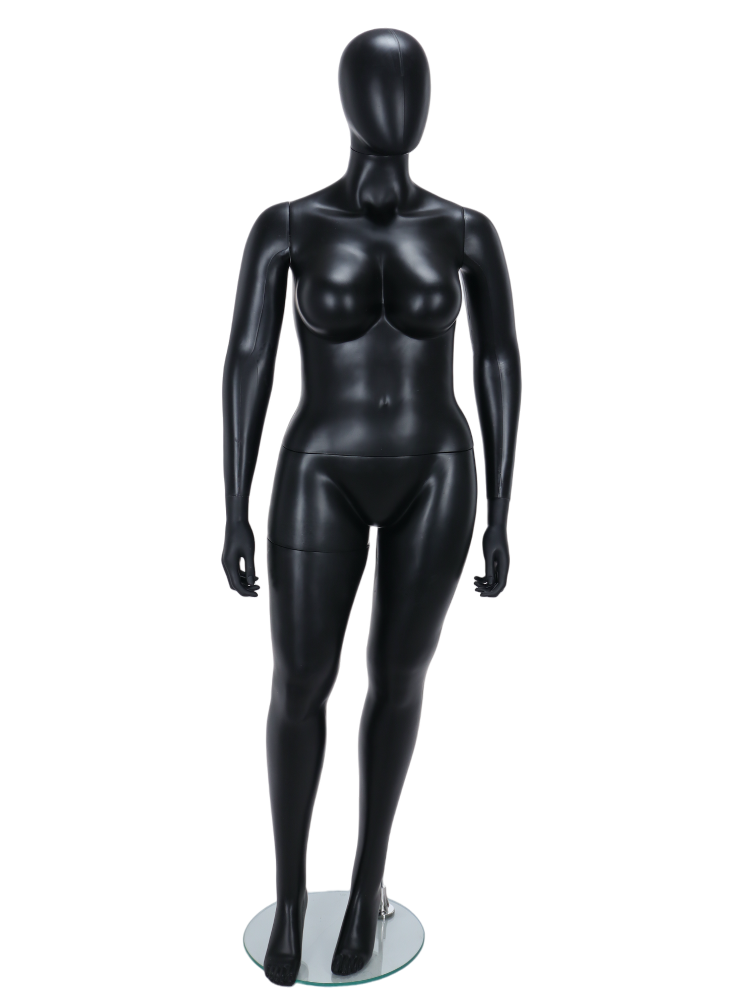 This fuller-figured female mannequin features a lifelike proportion and a clean black finish, making it perfect for displaying a diverse range of clothing, accessories, and jewellery. Constructed from durable plastic, it is virtually unbreakable and hard-wearing. The mannequin includes an 8mm thick toughened glass base and a calf-and-foot kit for fitting socks or shoes. Adjustable arms offer versatile posing options, while its lightweight design ensures easy handling and transportation. Ideal for professional retail environments seeking quality and realistic presentation.