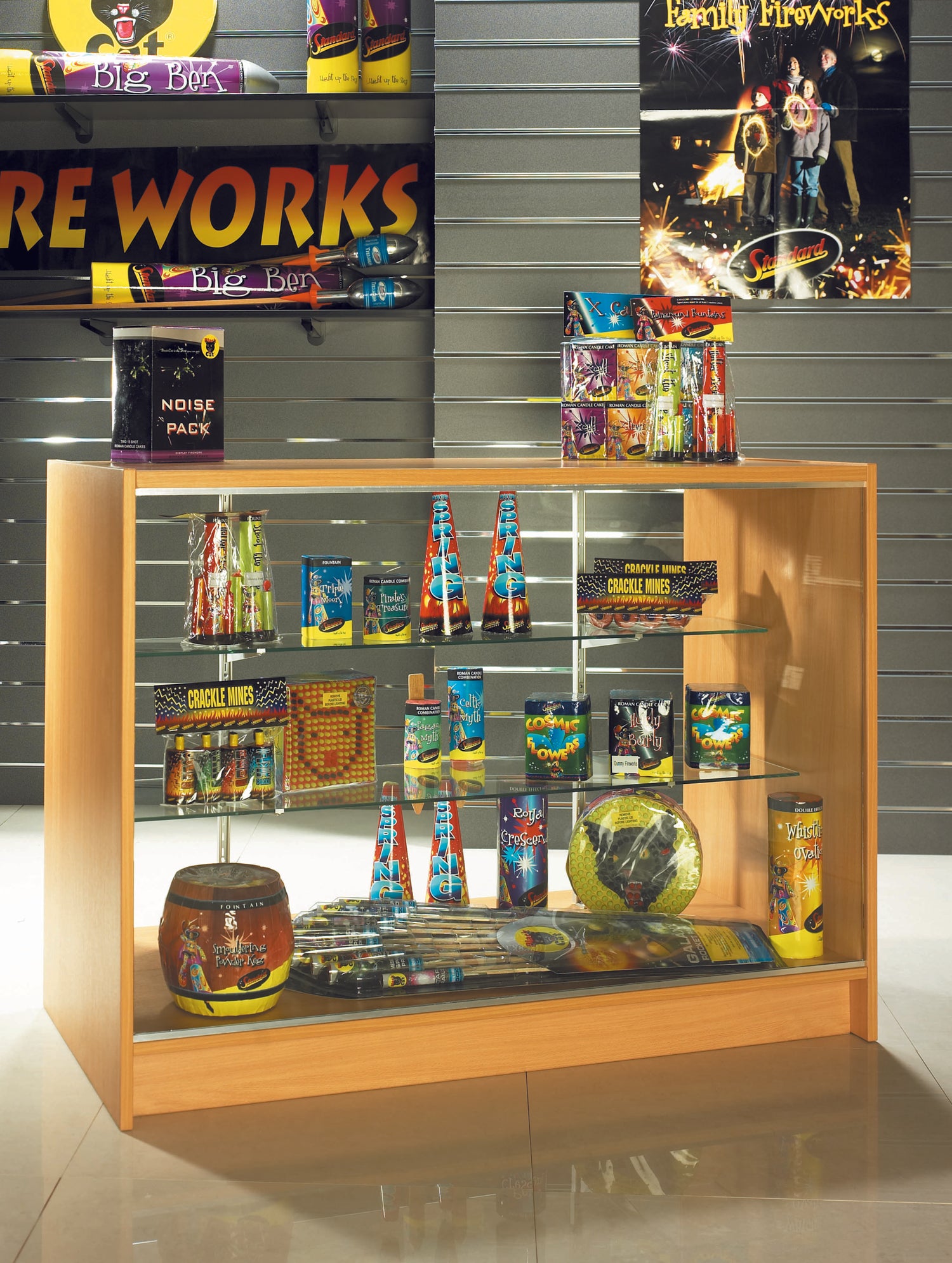 The Full Glass Counter with Solid Top from UK Shopfittings Ltd is built from durable melamine-faced MDF, measuring approximately 900mm high, 1200mm wide, and 600mm deep. It features a solid top surface combined with full glass panels, providing an elegant and functional display area. The counter includes open storage at the rear with two adjustable glass shelves for flexible organization. Matching the finishes of UK Shopfittings' slatwall panels, this unit offers a professional and cohesive retail solution.