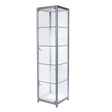 Full Glass Single Door Tower Showcase Display Unit with integrated LED lighting system. Constructed from silver anodised aluminium framing with 6mm toughened safety glass doors and 8mm toughened safety glass shelves for maximum durability and security. Features four fixed shelves at 350mm intervals, one fixed LED downlight, and four adjustable 4W LED lights for optimal product illumination. Lockable display area with integral ON/OFF switch. Ideal for retail environments, reception areas, and high street displays. Supplied flat-packed with assembly instructions included. This product is a palletised delivery service.