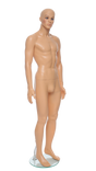 The Male Mannequin R320 features realistic proportions and natural posture with detailed facial features, perfectly suited for showcasing fashion items. Its adjustable head and arms allow for versatile display options, while the detachable design simplifies dressing and assembly. The mannequin stands securely on a stylish glass base with heel support, ensuring easy shoe fitting and stable presentation. The included base adds both practicality and a modern aesthetic for professional retail environments.
