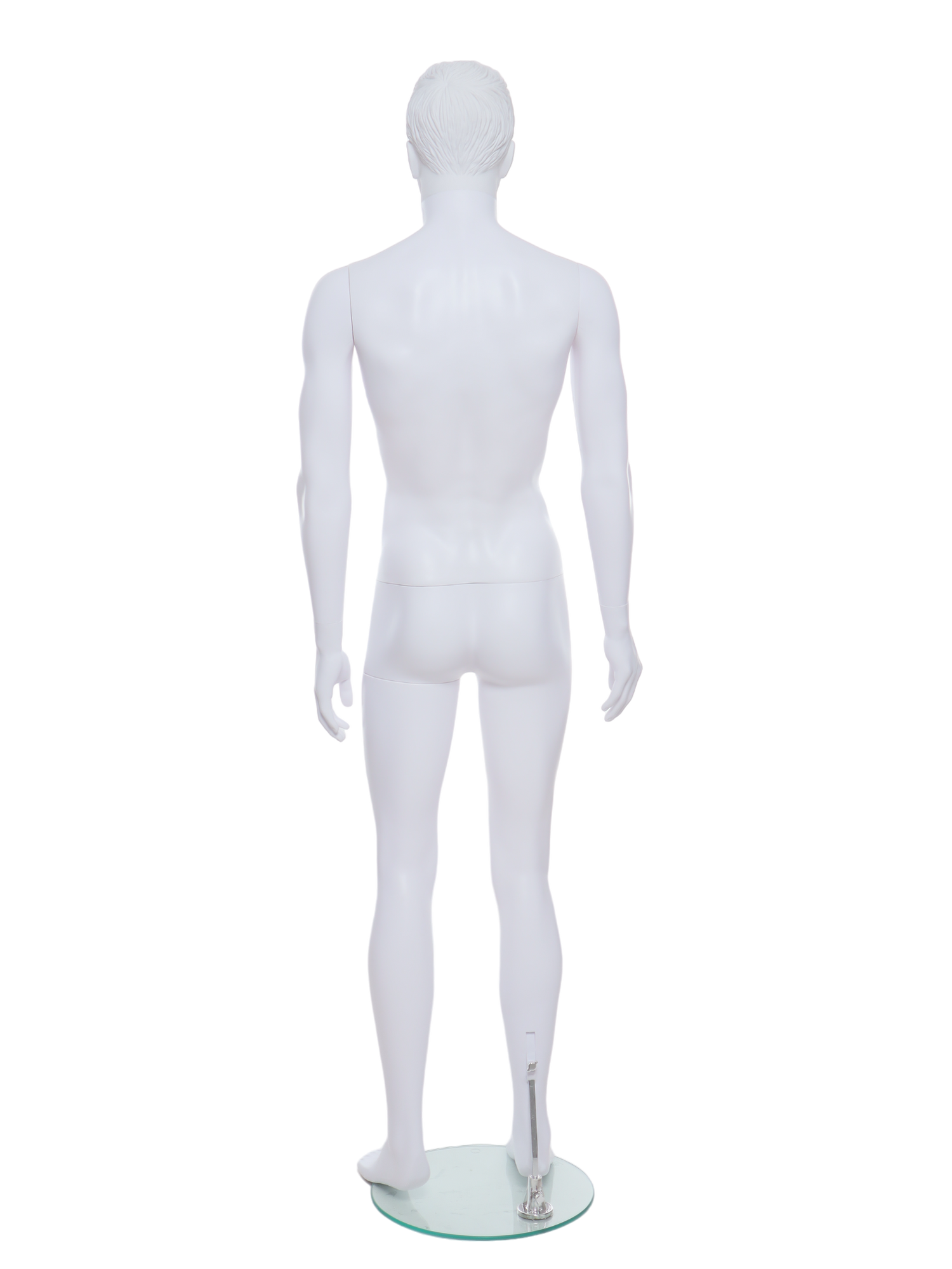 The Male Mannequin R322 features realistic proportions and a natural posture, designed to present fashion items with authenticity. Its minimal facial details and moulded hair contribute to a versatile display, while adjustable head and arms allow for customized styling. The mannequin separates for easy dressing and quick assembly. A sturdy glass base with heel support ensures stability and simplifies shoe fitting, completing a sleek, contemporary presentation ideal for professional retail environments.