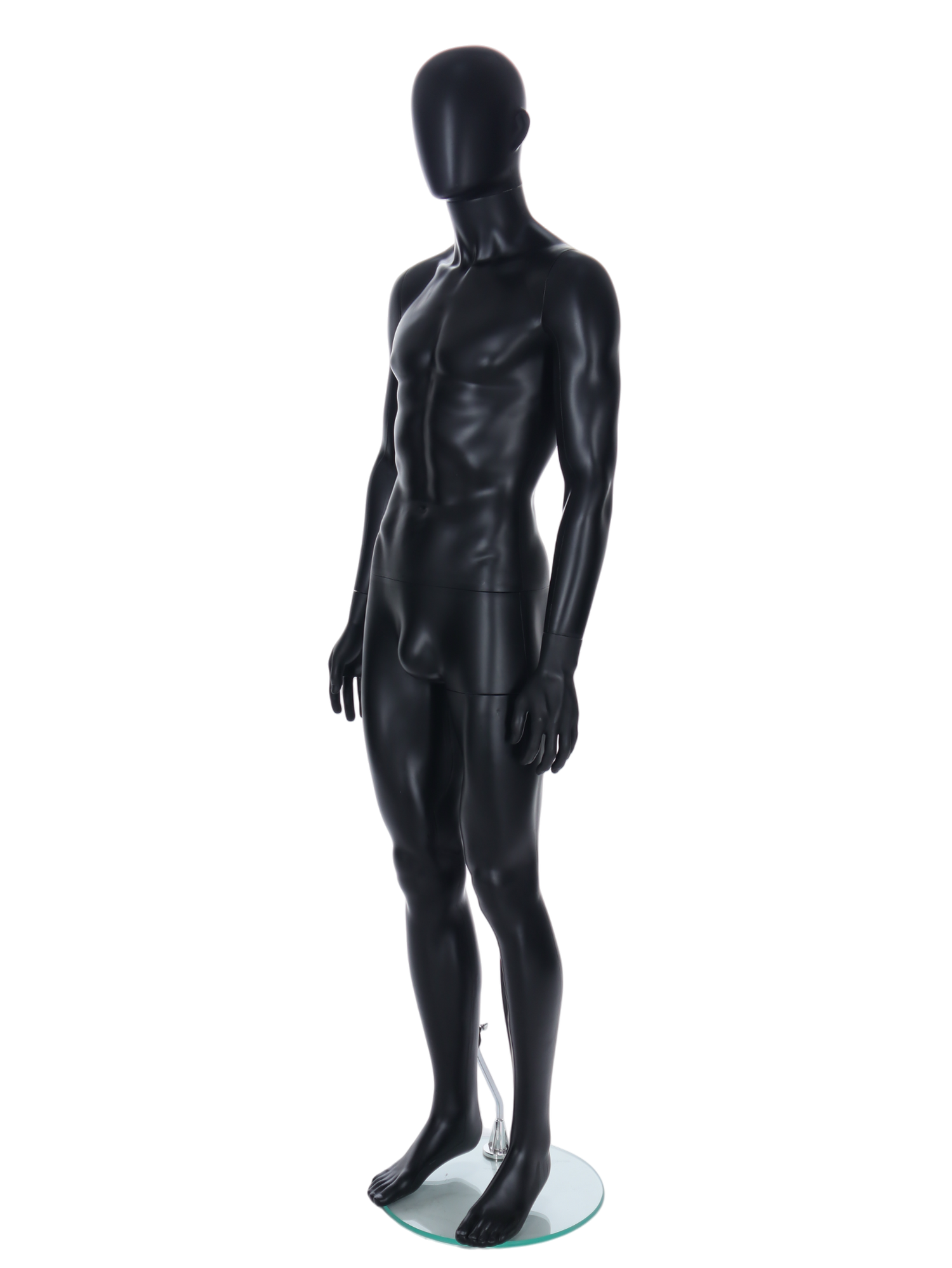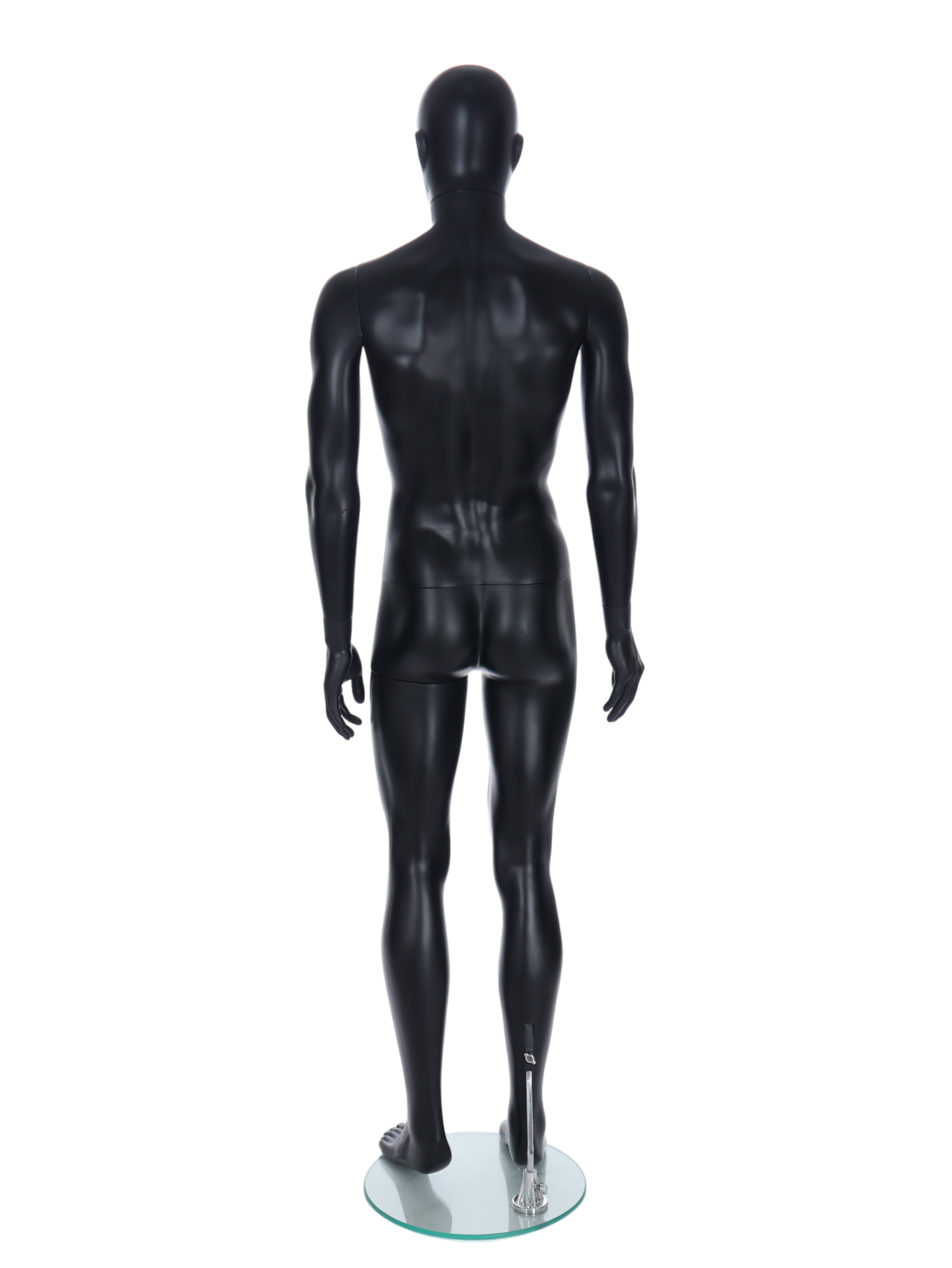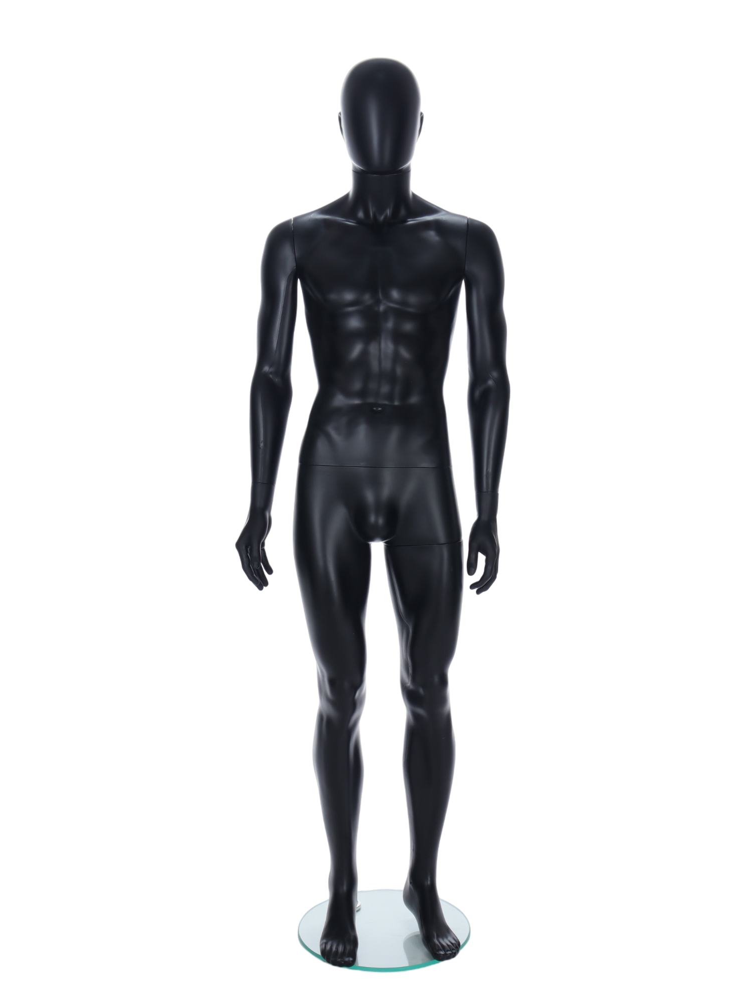 This full-bodied male mannequin in a black finish features an egg-shaped head with ears, making it perfect for displaying a variety of clothing, accessories, and jewellery. It includes a sturdy 8mm toughened glass base and comes with a calf and foot kit to accommodate socks and shoes. Crafted from durable plastic, this nearly unbreakable mannequin offers adjustable head and arms for versatile posing. Its lightweight design ensures easy handling and transport, ideal for professional retail or showroom environments.