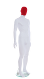The Male Mannequin - R357RP features a sleek White finish contrasted by a unique Red Pile head with ears, designed to captivate attention and showcase clothing and accessories boldly. Crafted from virtually unbreakable plastic, it offers durability suited for high-traffic retail environments. Its 8mm thick toughened glass base and calf spigot fitting provide stable support and allow for effective footwear display, completing any outfit presentation. Ideal for fashion and sports stores, this modern, edgy mannequin ensures your displays stand out with sophistication and style.