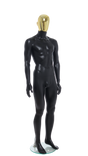 The Male Mannequin - R358GD features a sleek black finish contrasted by a unique Gold pile egg head with ears, designed to captivate attention and showcase clothing and accessories boldly. Crafted from virtually unbreakable plastic, it offers durability suited for high-traffic retail environments. Its 8mm thick toughened glass base and calf spigot fitting provide stable support and allow for effective footwear display, completing any outfit presentation. Ideal for fashion and sports stores, this modern, edgy mannequin ensures your displays stand out with sophistication and style.