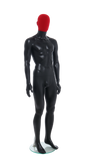 The Male Mannequin - R358RP features a sleek black finish contrasted by a unique Red Pile egg head with ears, designed to captivate attention and showcase clothing and accessories boldly. Crafted from virtually unbreakable plastic, it offers durability suited for high-traffic retail environments. Its 8mm thick toughened glass base and calf spigot fitting provide stable support and allow for effective footwear display, completing any outfit presentation. Ideal for fashion and sports stores, this modern, edgy mannequin ensures your displays stand out with sophistication and style.