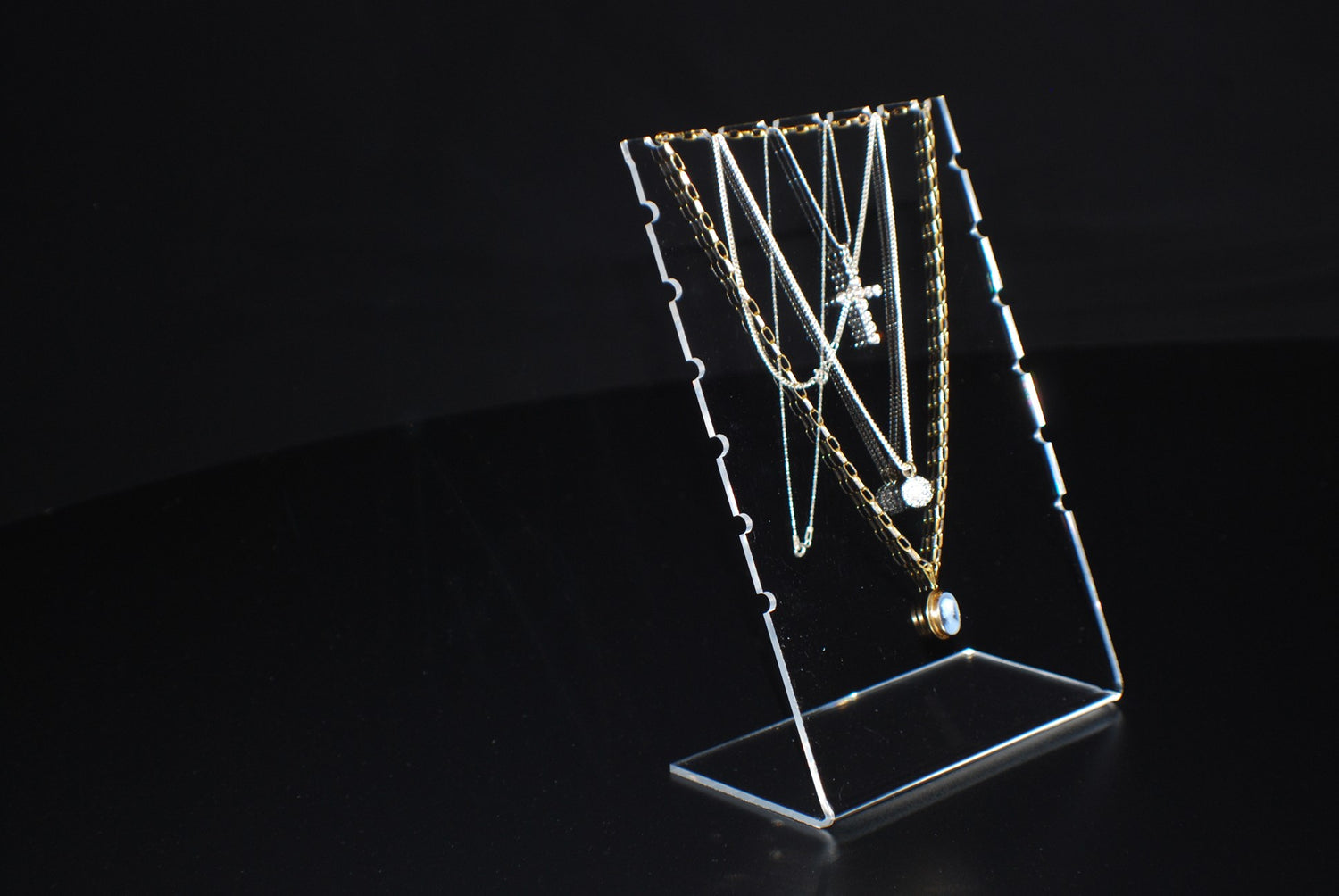 These multi-chain acrylic displays are crafted from sturdy 3mm acrylic, designed to hold up to 9 necklaces or chains simultaneously with 18 precision-cut holes. Available in black or clear finishes, they offer a compact solution to organise and showcase your jewellery efficiently. Measuring 220mm in height and 150mm in width, these displays optimise space while providing a professional presentation for your collection.