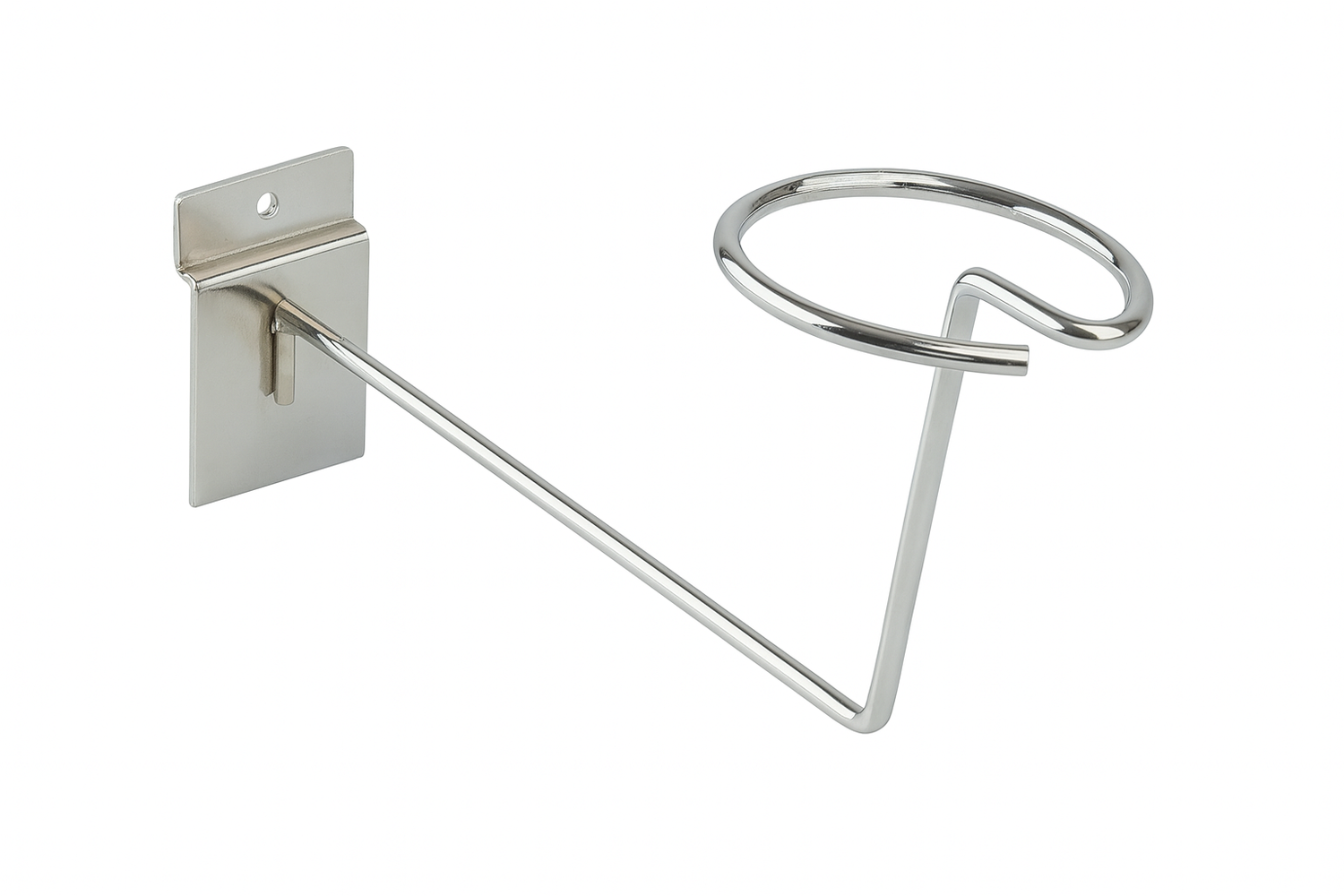 The Slatwall Millinery Arm, finished in sleek chrome, is specifically designed for use with slatwall panels. Expertly crafted to showcase hats, it offers a secure and stylish display solution that enhances product visibility while maintaining a professional retail environment.